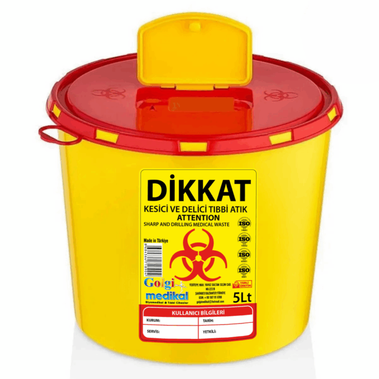 Single-use, puncture-resistant medical waste bin made of high-quality, healthcare-grade plastic. Includes a user-info sticker (Institution, Date, Service, Authorized). Available in 2L and 10L. For additional size and liter (L) options, please contact us.